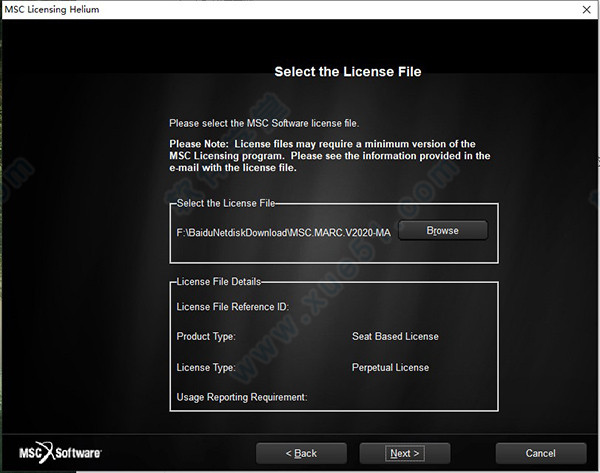 3、再双击“msc_licensing_helium_windows64_a.exe”文件安装许可证管理工具,浏览生成的许可证文件License.dat