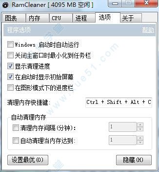 5、选项选项卡中用户不仅可以通过手动来释放内存,还可以通过设定内存清理间隔来定期自动清理。