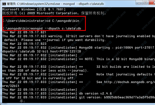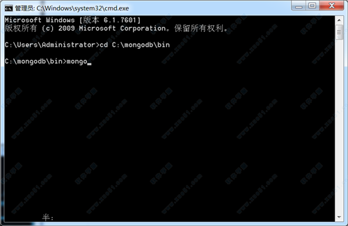 我们可以在命令窗口中运行 mongo.exe 命令即可连接上软件(cd C:\mongodb\bin>mongo)
