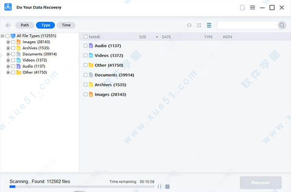 2、扫描位置-选择文件类型,然后单击“扫描”按钮以扫描所选的硬盘驱动器/设备以查找丢失的数据。