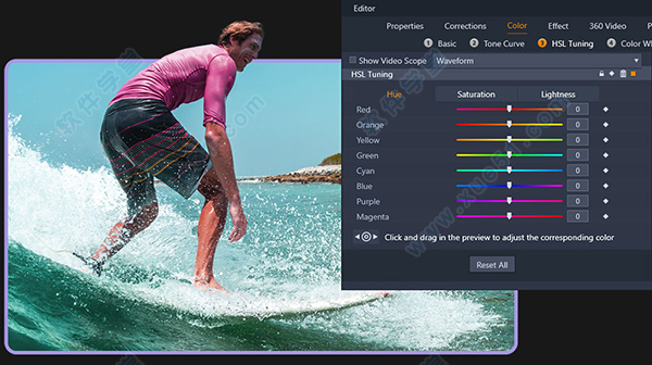 诸如“色调曲线”,“HSL调音”,“色轮”和“选择性矢量示波器”之类的高级控件使您可以轻松地独立调整颜色,高光,中间调和阴影。