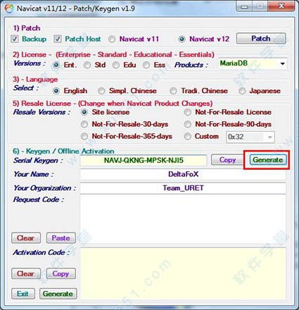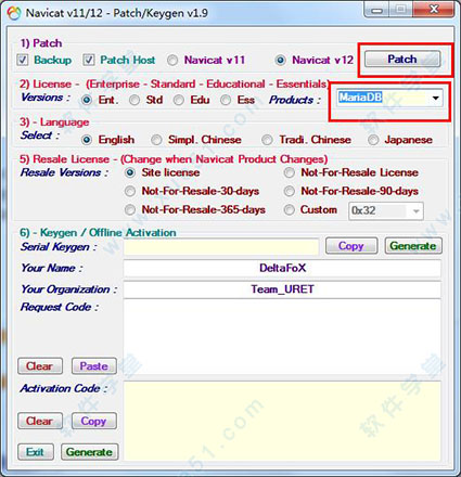 2、运行Navicat_Keygen_Patch_v1.9_By_DFoX_URET.exe注册机,选择navicatv12,右上角选择mariadb,其他的可以按默认,再点击patch;