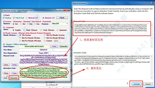 9、这里将request code的代码复制到注册机中,再点击generate得到激活码,填入注册界面,单击activate;