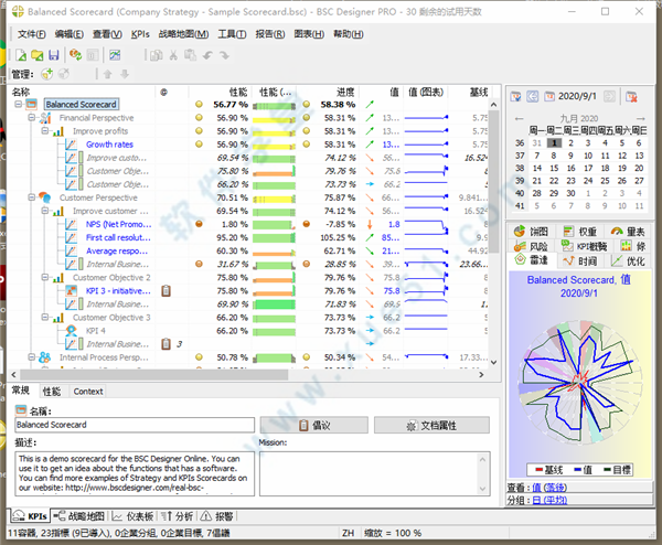 BSC Designer Pro是一款功能十分强大的绩效管理软件,软件能够帮助用户对公司各个成员绩效进行有效的实时监控。通过对绩效的监控用户可以看到每日任务的完成情况,能够更好的部署下一步的战略计划。软件拥有着平衡计分卡框架,它能够从财务、客户、内部运营、学习成长等四个角度来分析当天的整个公司的绩效,能够将整个公司完成任务的情况使用数据的形式摆放在管理者的面前。目前该框架已经经过了更新换代过数次,功能全面性上能够满足用户日常对绩效以及战略部署的需求。与同类型软件相比这款的数据更加的直观操作界面也更加的简单。用户可以通过数据显示界面的数据一眼就能够看出来当天的绩效,这是其他软件所不具备的。这款软件的操作也并不复杂,经过开发者的简化用户只需要输入一定的数据就能够看到各种当天的各种数据的分析。小编带来的