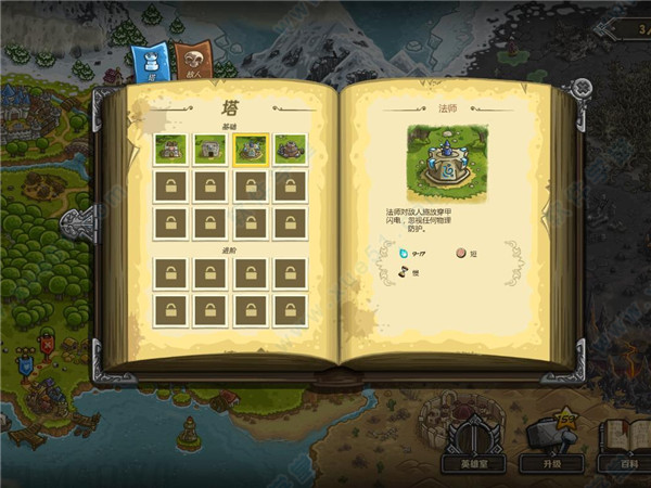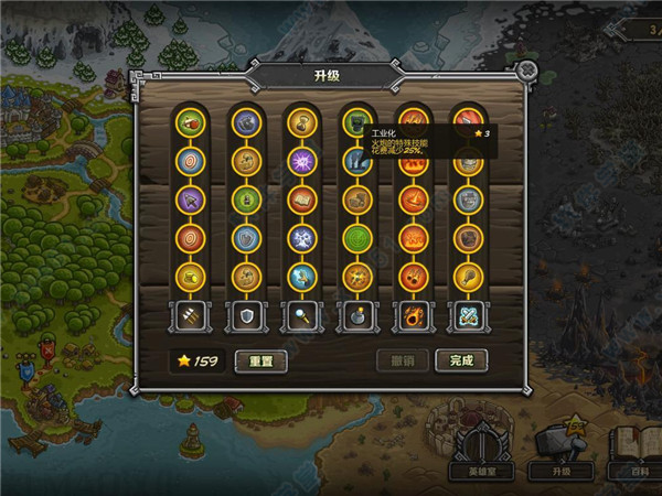 4、特殊技能介绍:第一个是流星火雨,可以烧伤敌人,强化后还可以在降落点形成残留的岩浆来杀伤经过的敌人;第二个是紧急招募民兵参战,这个是很灵活的一个技能,可以随意放置民兵位置,用来拖延时间并配合弓箭塔十分不错!