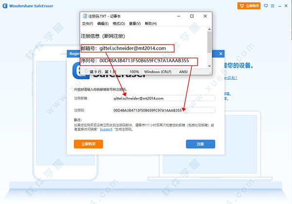 2、将注册码.TXT文本内邮箱号和注册码复制到软件注册界面对应方框中,最后点击注册