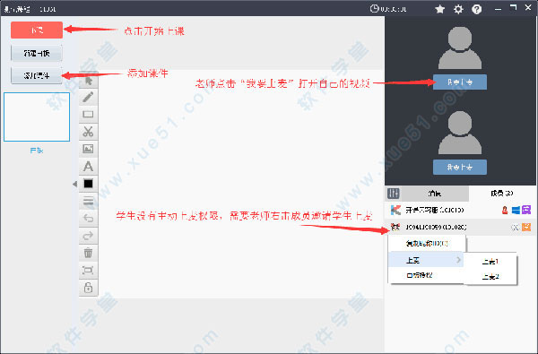 四、进入教室后,学生没有主动上麦(开启视频)的权限,需要老师授权学生上麦,然后开始上课。