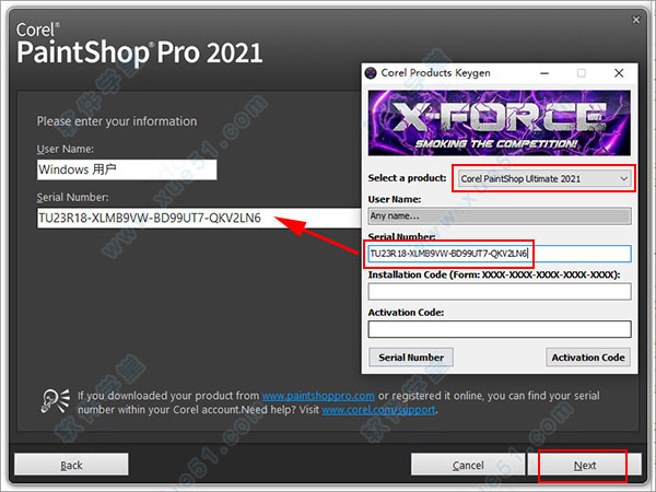 2、然后依向导提示一步一步进行操作安装软件,安装到这里,需要填写注册码,运行Crack文件下Keygen.exe注册机,弹出界面,选择产品本身生成注册码序列号,最后将获取的注册码复制到软件安装界面中,如下图所示: