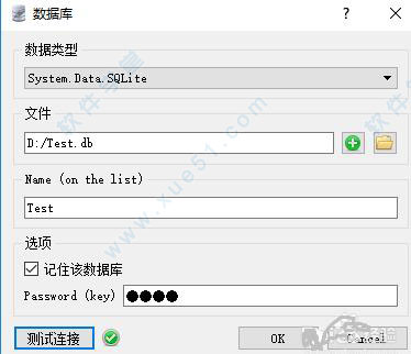 2、数据类型选择“System.Data.SQLite”,点击绿色添加按钮,将文件保存至D:\Test.db,并在Password一栏内输入密码:2017(如不使用密码,此处留空即可),然后点击“OK”按钮即可创建一个加密版本的SQLite DB文件;