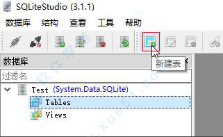 3、双击“Test”数据库,将会显示其下的子节点,选择“Tables”,并在工具栏点击“新建表”按钮;