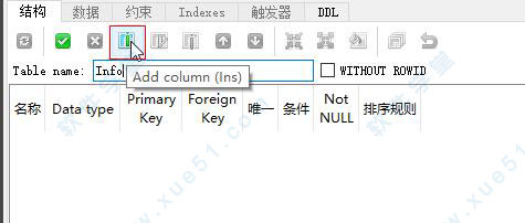 4、在Table name文本框内输入表名Info,并点击“Add columns(Ins)”图标以便添加列;