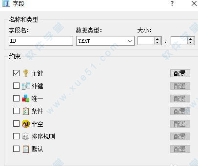 5、添加第一个字段,字段名为ID,数据类型为Text,将主键前的复选框打钩,并点击“OK”按钮;