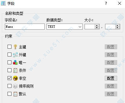 6、重复第4个步骤,点击“Add columns(Ins)”图标以便添加另外一个列,字段名为Name,数据类型为Text,将非空前的复选框打钩,并点击“OK”按钮;