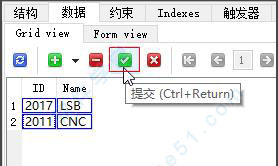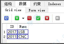 10、在行数据编辑栏里输入两条数据,第一条数据ID为2017、Name为LSB,第二条数据ID为2011、Name为CNC;