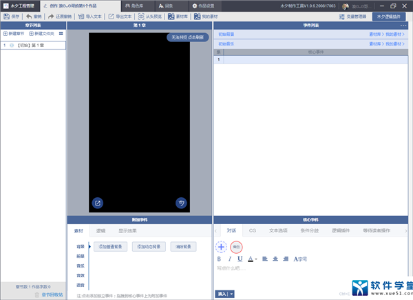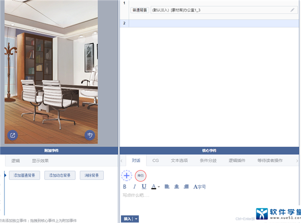 7、点击核心事件可以设置核心对话,可以点击添加对话和文本选项,同时可以进行逻辑插件设置