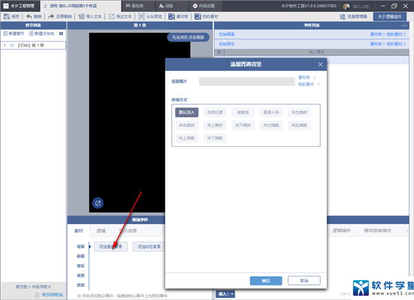 5、点击添加普通背景弹出添加普通背景弹框,该弹框可以进行图片背景添加和转场方式设置