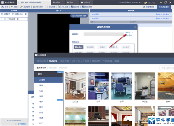 6、点击素材库弹出软件素材库挂历页面,该页面可以进行角色立绘、普通、动态等背景进行设置
