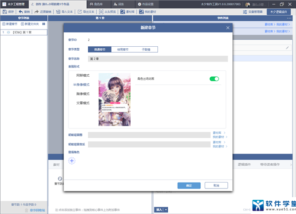 9、点击创建章节弹出新建章节弹框,该弹框可以进行章节类型设置和设置章节名称