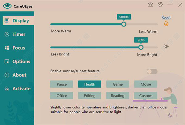 您可以在选项中启用日出/日落功能,为白天和黑夜设置不同的色温和屏幕亮度。CareUEyes将根据日出和日落时间自动切换设置。