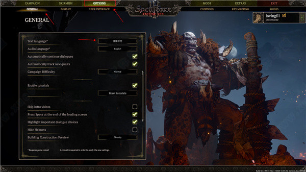2、游戏默认界面还是英文,这里点击options—general—text language,设置为简体中文重启游戏即可;