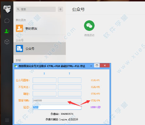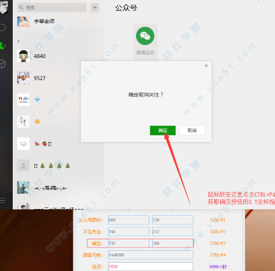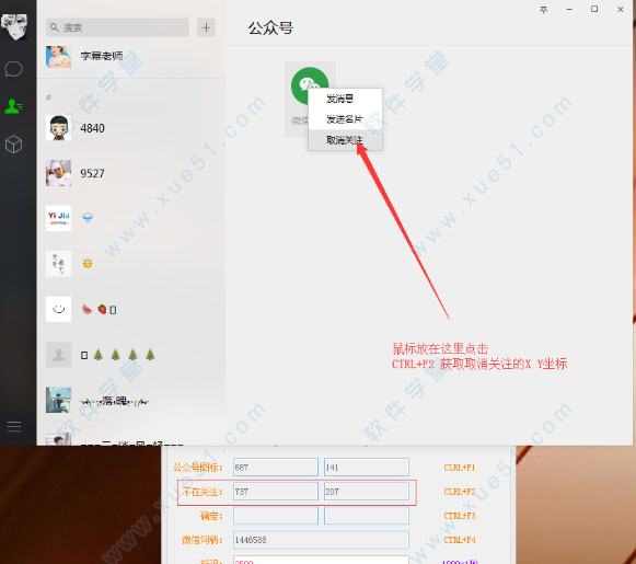 1、运行打开微信取消公众号关注助手pc软件,鼠标放在微信窗口内单击CTRL+F4获取微信句柄