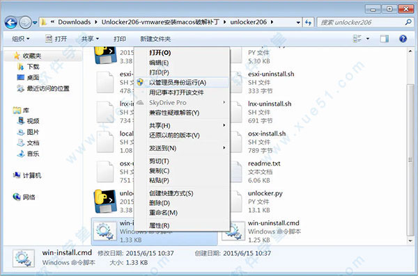 3、将软件包中的Unlocker进行解压,以管理员的身份运行"win-install.cmd",会弹出一个命令行窗口,待补丁打好以后,命令行窗口会自动关闭;