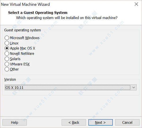 4、接下来选择虚拟机的操作系统。选择“Apple Mac OS X”,再将“版本”(Version)设为“OS X 10.11”;