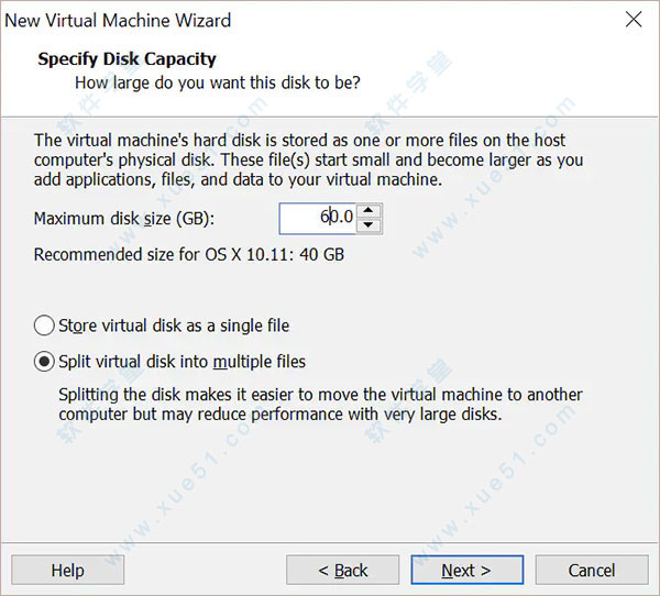 6、指定虚拟磁盘,选中Split virtual disk into multiple files;