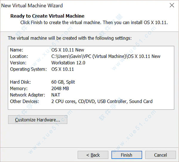 7、确认虚拟机的硬件配置,若需要调整,即可点击Customize Hardware;