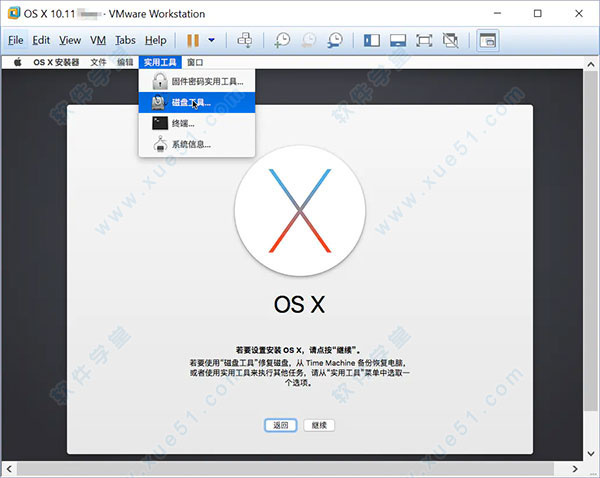 3、因为我们还没抹掉虚拟机的硬盘,需要点击屏幕顶部a菜单栏上的“实用工具"→“磁盘工具”,启动“磁盘工具”;