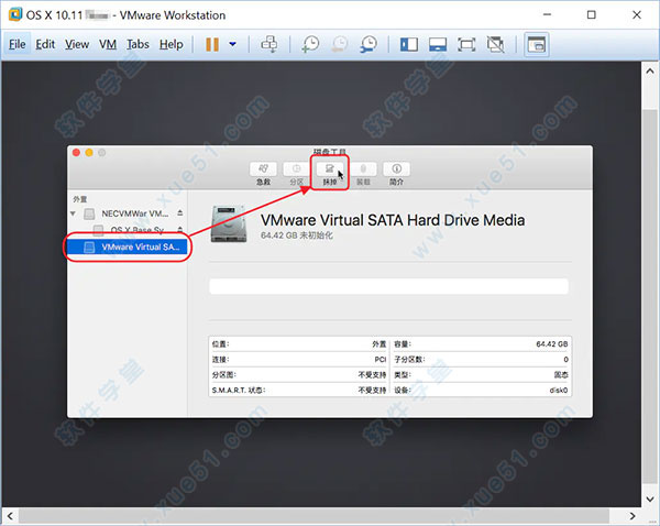 4、先在左侧栏里选中“Vmware Virtual SA……”,然后点击工具栏里的“抹掉”;