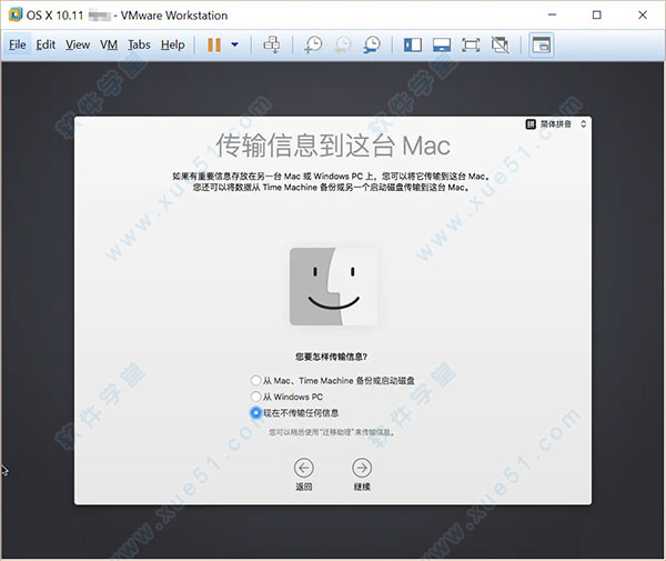 11、“传输信息到当前Mac”类似Windows的“数据迁移助手”,选择“现在不传输任何信息”;
