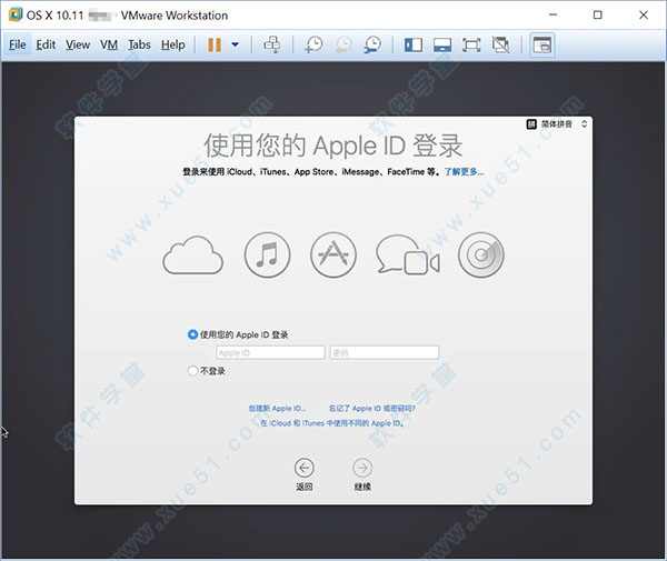 4、虚拟机重启后会进入这个登录界面,选择你的Apple ID对应的邮箱,输入密码,进行登录,点击屏幕左上角的苹果图标,选择“关于本机”——“软件更新”;