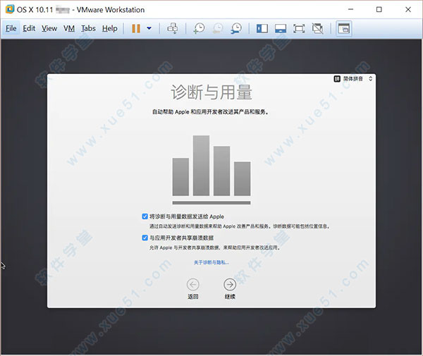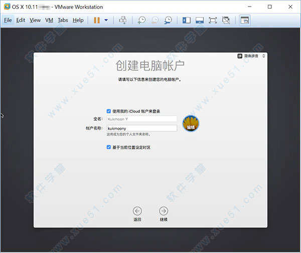 13、要求你同意安装条款,并创建一个用于登录的账户,选择“使用我的iCloud账户登录”和“基于当前位置设定时区”,点击“继续”,然后等待系统创建账户;
