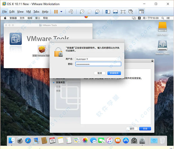 2、虚拟机桌面上弹出一个“VMWare Tools”窗口,双击“安装VMWare Tools”,弹出“安装VMWare Tools”向导,系统要求你输入密码。输入密码(这里的密码是你的Apple ID密码)以后,点击“安装软件”;