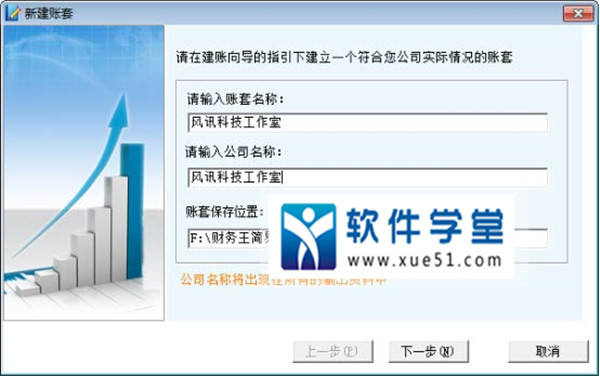 3、账套保存位置:账套存放在电脑的位置。新建账套默认全部存放在软件安装路径下的【账套】文件夹。点击【下一步】,如下图: