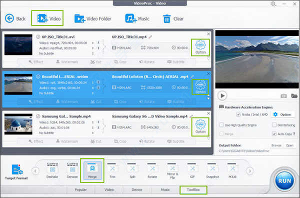 (3)在主界面上勾选合并按钮,然后单击运行,将所有添加的视频剪辑快速合并到一个文件中