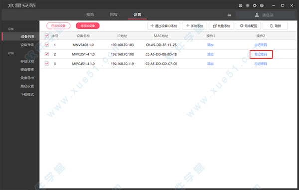 点击【设置>设备列表>待添加设备】,刷新后可以看到未添加的摄像头。点击摄像头后面的【忘记密码】。