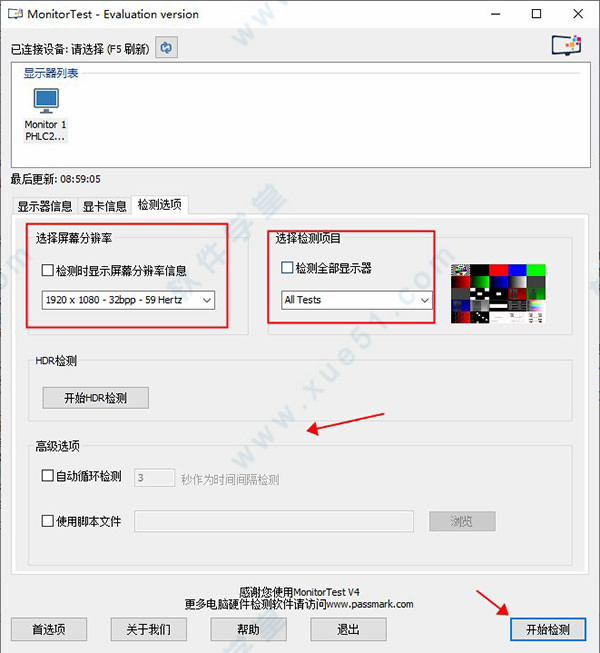 1、选择要测试的显示器,或选中“测试所有显示器”复选框以一次测试所有显示器(“测试所有显示器”仅在注册版本中可用)。