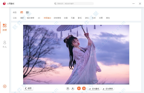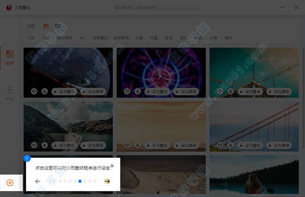 8、在主界面中火雨壁纸中的资源会以缩略图的方式来进行展示,单击可配合到单个资源预览模式