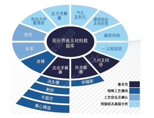 Fe—C合金专用模型:包括共晶/共析球墨铸铁、共晶/共析灰El/白口铸铁、Fe—C合金固态相变模型等。运用这些模型能够定性和定量地计算固相转变、各相如奥氏体、铁素体、渗碳体和珠光体的成分、多少以及相应的潜热释放。