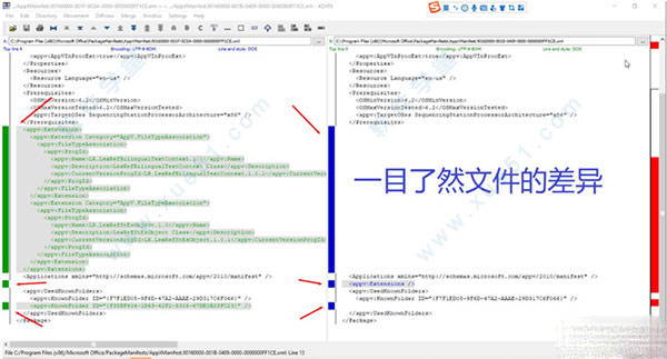 如果在一行中有一份文件是相同的另一份文件是不同的那么就会通过颜色显示文件的不同之处。红色代表文件中的差异。