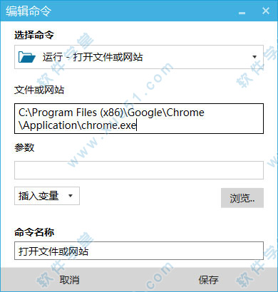 双击刚添加的命令(或点击右下角的编辑按钮),弹出编辑命令窗口。 选择 运行-打开文件或网站,把Chrome的图标拖进来(或点击浏览...,选择Chrome的快捷方式或exe文件)。最后点击保存。