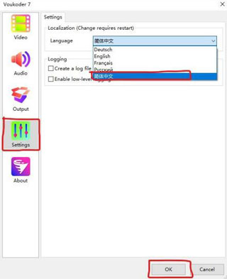 3、在界面选择“Settings”,然后在Language这里选择“简体中文”,点击OK。