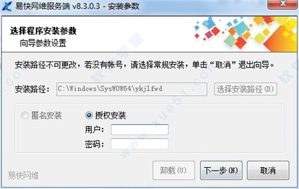二、运行于被控端电脑,使用注册的管理帐号授权,主机选择【通用主机名】,其它参数不用管,点击安装到完成。