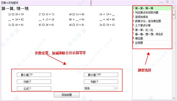 2、左边是各种题目参数的设置,想加减乘除等等的合并运算,题目数量等等,右边是各种题型。