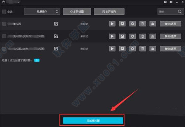 此时进入多开器界面,点击箭头指的添加按钮,即可弹出下图2所示选择菜单,选择复制或新建一个全新模拟器,根据需要创建多个模拟器,这里已经创建了3个。