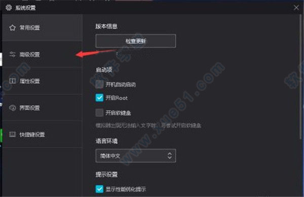 4、在系统设置页面,点击左侧箭头所指的高级设置,进入到高级设置页面。