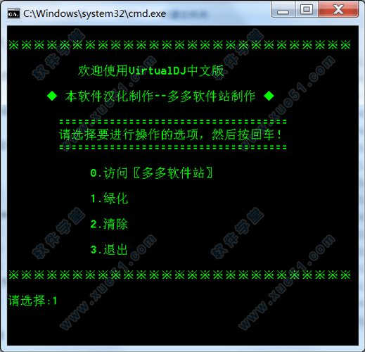 1、解压压缩包,首先将软件进行绿化,双击“安装和删除配置.BAT”选择“1”绿化软件,如果出现了误报病毒的情况,请点击允许。