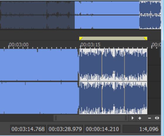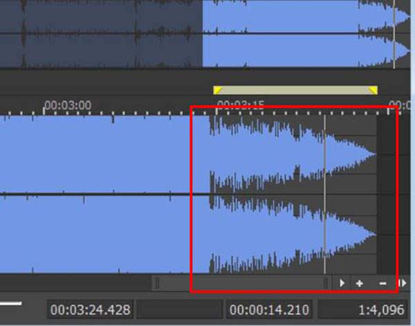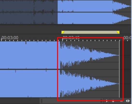 首先,大家需要先选取音频靠近结尾的一段。当然,用户可以针对音频的任何位置作淡化处理。为了演示音乐渐渐淡去的效果,小编会选取音频靠近结尾的一段。